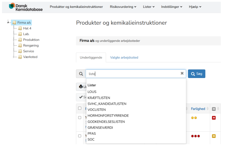 Ved at skrive ”liste” i søgefeltet får I adgang til relevante myndighedslister. Vælg fx ”Kræftlisten”, og få vist alle produkter, der indeholder stoffer på listen.